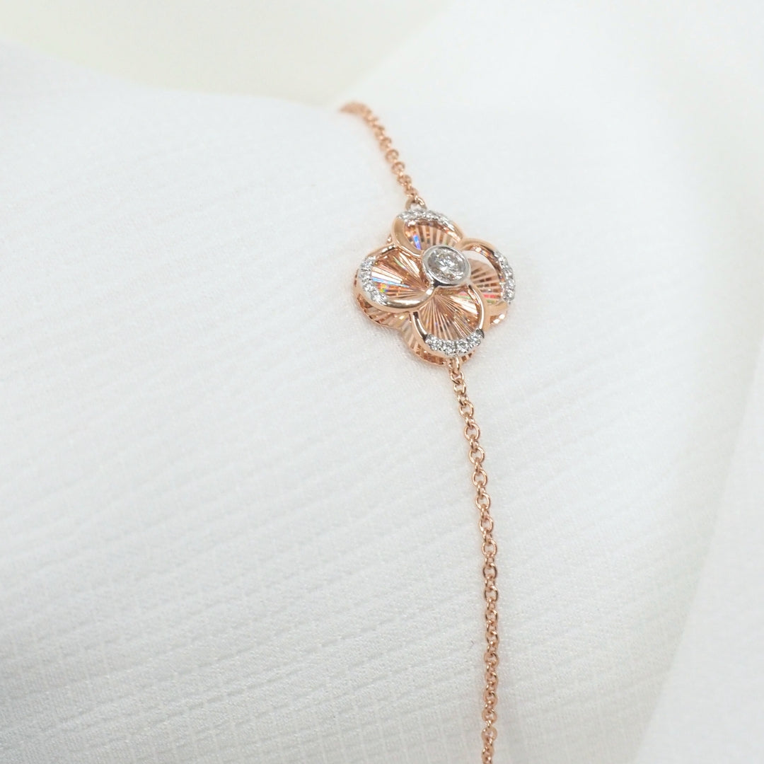 The MUSE Camellia Bracelet blossoms with guilloché-engraved petals in radiant 18K rose gold, accented with a sparkling diamond. Draping the wrist with delicate grace, it is a celebration of beauty, femininity, and timeless refinement.