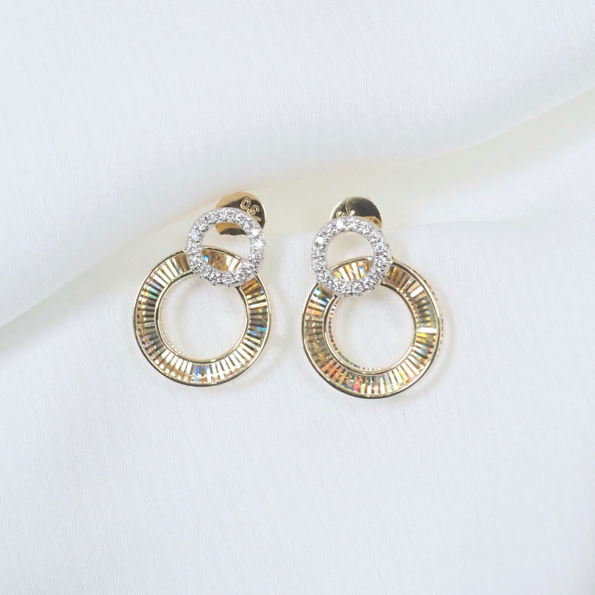 The MUSE Circle Radiance Earrings echo the graceful double-circle design of the necklace in a perfectly balanced pair. Each earring features one circle adorned with guilloché-engraved lines in 18K yellow gold, glimmering with subtle rainbow-like reflections, while the other sparkles with brilliant diamonds. Worn together, they embody harmony and connection — minimal yet refined, quietly sophisticated, and full of meaning.