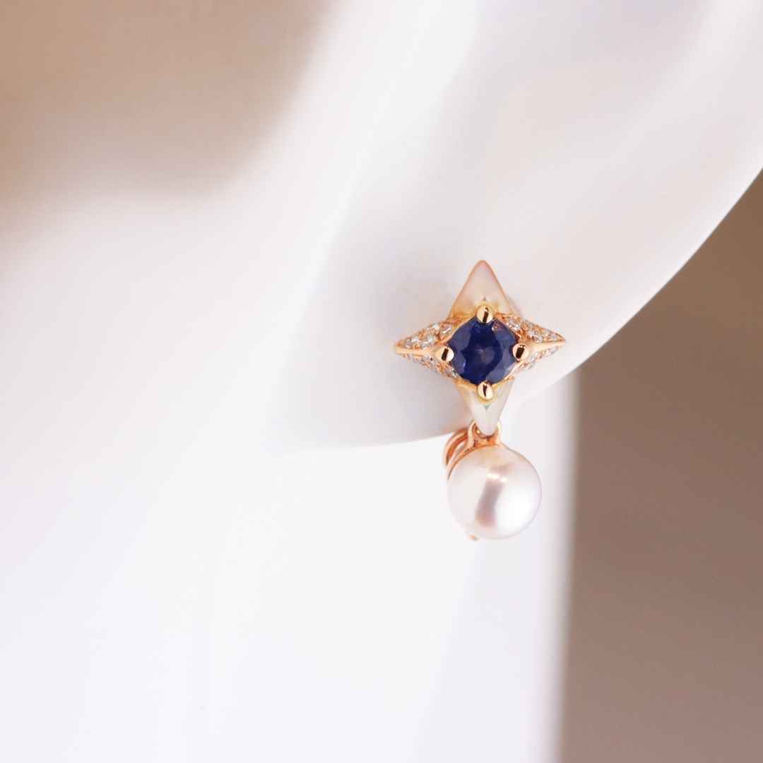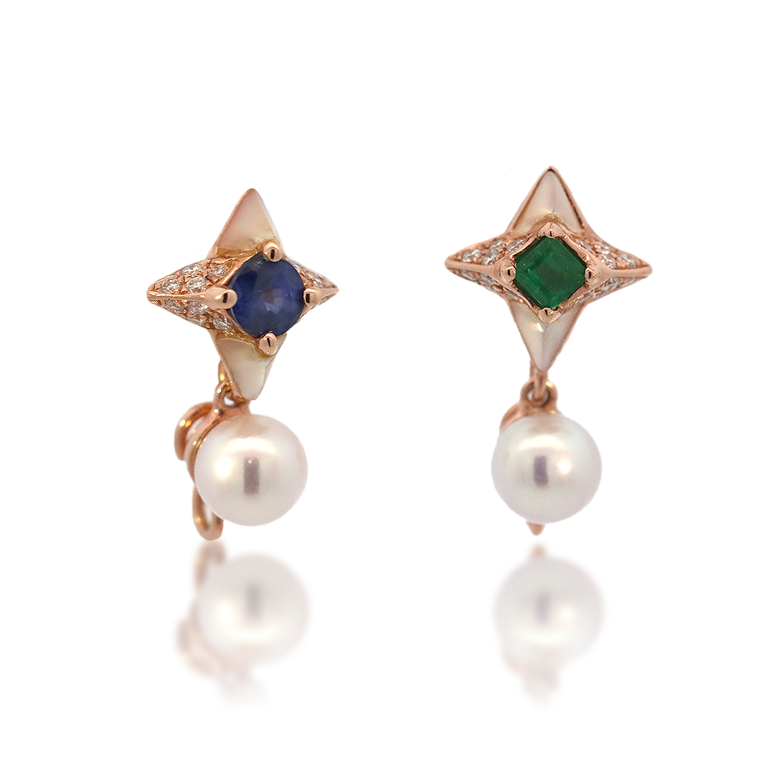 Introducing the Ocean Mirage Earrings, an exquisite blend of the ocean's elegance and sophisticated luxury. Each earring features a captivating 0.24ct sapphire on one side and a 0.15ct emerald on the other, creating a stunning contrast of vibrant colors. Adorned with Mother of Pearl and accentuated by the timeless beauty of Akoya pearls, these earrings are further enhanced by 0.20ct of brilliant diamonds. Crafted in luxurious 18K rose gold, the Ocean Mirage Earrings exude a serene elegance and refined charm. Let the Ocean Mirage Earrings bring a touch of the ocean's splendor to your style and elevate your jewelry collection.